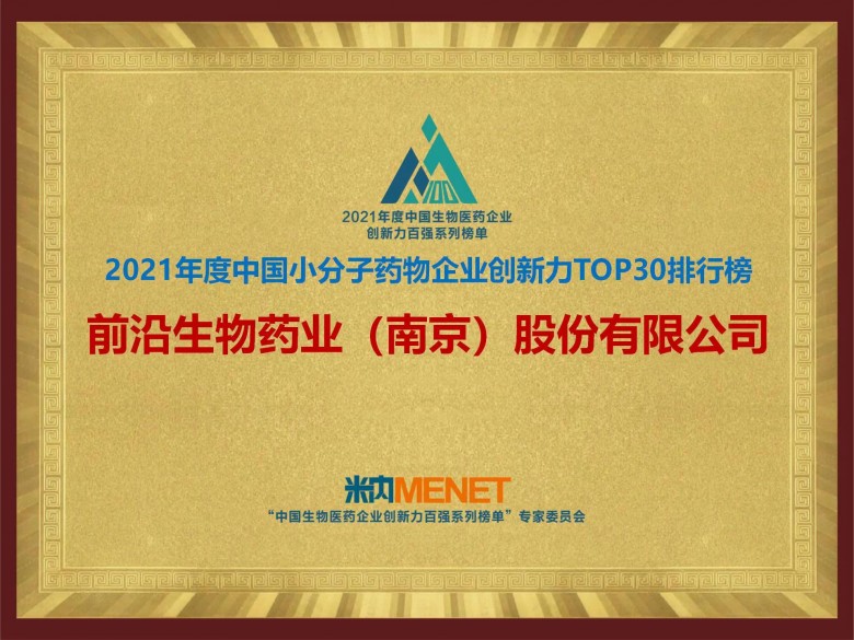 9月16日,由米內網(wǎng)主辦的“惟創(chuàng )新者行穩致遠——2021年度中國生物醫藥企業(yè)創(chuàng )新力百強系列榜單發(fā)布會(huì )”隆重舉行并揭曉系列榜單,評選榜單以科技部《企業(yè)創(chuàng )新能力評價(jià)指標體系》為理論依據,結合創(chuàng )新投入、創(chuàng )新成果等指標維度,及權威公開(kāi)數據統計,遴選出中國具有醫藥創(chuàng )新實(shí)力的100家企業(yè)。前沿生物(股票代碼:688221.SH)作為國內創(chuàng )新藥領(lǐng)軍企業(yè),再次成功入選細分榜單——中國小分子藥物企業(yè)創(chuàng )新力 TOP30,并受邀出席本次大會(huì )。